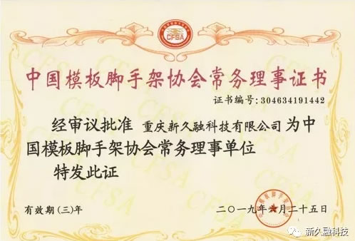 熱烈祝賀重慶新久融科技榮獲中國模板腳手架協(xié)會常務(wù)理事單位稱號2019年6月,新久融科技正式加入中國模板腳手架協(xié)會,并榮獲協(xié)會常務(wù)理事單位稱號。中國模板腳手架協(xié)會是國家一